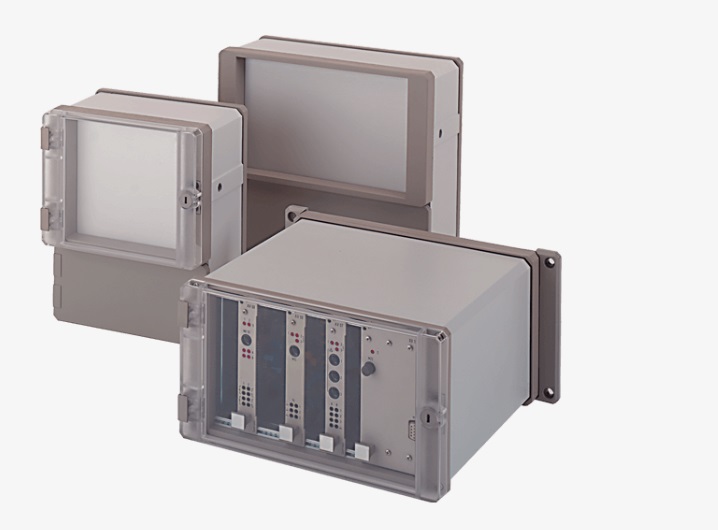 Корпуса изготовлены из высокопрочного алюминиевого профиля, оснащены стандартными боковыми направляющими для печатных плат, имеют модульную конструкцию и степень защиты IP 65.
