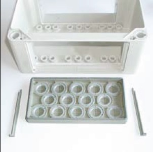 корпус состоит из крышки, уплотнителя, пластиковых замков, основания с отверстиями под фланец (фланцевые пластины заказываются отдельно) и комплекта резьбовых втулок.
